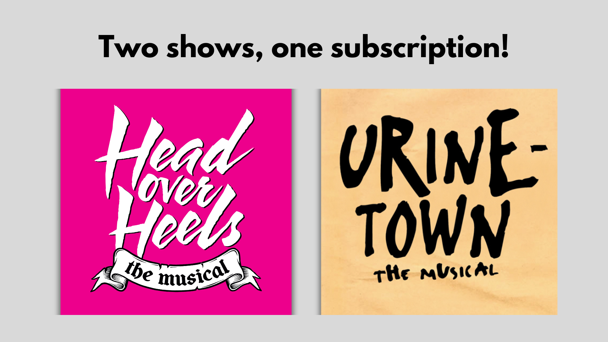 Subscribe to the Head Over Heels and Urinetown season and opt in to “receive communication from the show producer” to not only get a discount on this amazing season but also get exclusive early access to Come From Away tickets, including the special September 11, 2026 performance and gala.